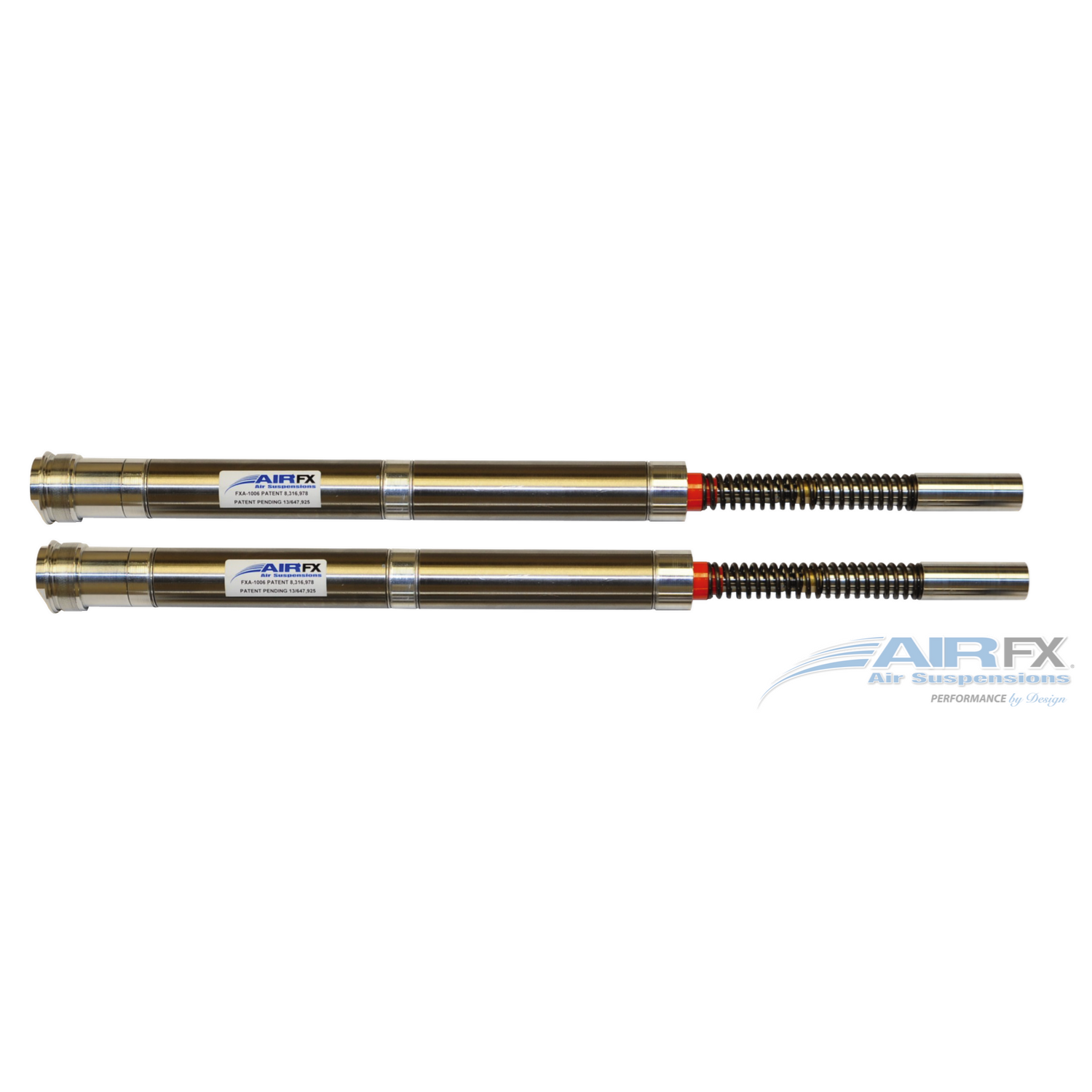 Front cartridge for 2018 Harley-Davidson Softail Fat Boy/Breakout models, stock front wheels. Front shocks make it easy to up-grade your factory internal fork assemblies. These replacement style cartridges are a perfect fit. Each cartridge has 2 chambers for lift, and 1 for rebound in axial alignment. This allows us to increase piston surface area, thus reducing air pressure required to lift. To dampen compression during hard braking we have add a booster spring. The result is a much smoother, and consistent ride and increased handling. Each kit is specifically designed to fit your bike without modification.