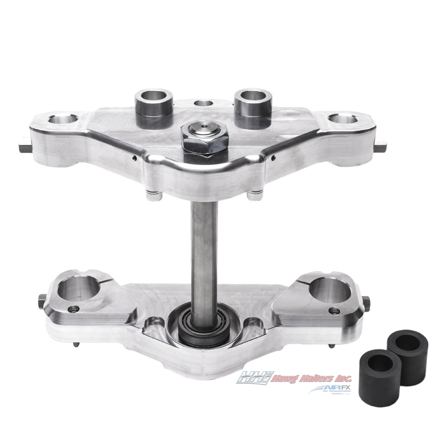 23" wheel. black anodized. HHI now offers a BOLT-ON triple tree kit for a 23'' wheel installation on FL touring model bikes. The design geometry of this triple tree results in a trail measurement similar to stock factory HD specifications. If you want a quick and easy, cost effective method of safely installing a 23" wheel, this is the solution. Our new kit offers the following features and benefits: Fits all 1987 and up FL Touring Model bikes with standard late model ignition location, both fairing and non-fairing. 6 degree triple tree rake results in stock trail geometry. Responsive and stable handling. Performs as good or better than stock. Direct bolt-on, NO modifications necessary. Positions front wheel forward approximately 2 inches. Headlight angle can be adjusted without the use of a raked bezel kit. Does not require fork extensions and uses stock length fork covers. Kit includes fork travel limiters to prevent fender interference. Stock fork lock fully functional. Works with stock and custom size rear wheels. Available in machine or black finish.