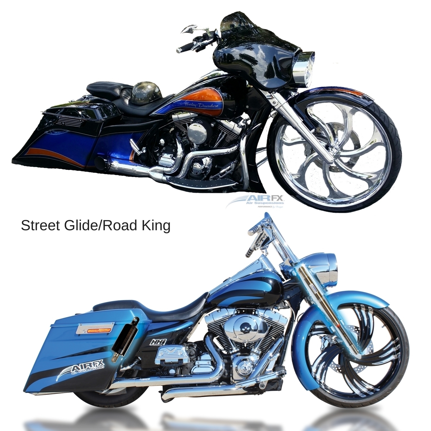 AirFX Kits for Harley-Davidson stock OEM not raked with 18”+21” Front wheel. Protect your bags from road rash when cornering. Our kits are designed to allow the air in the shock to react much faster than a standard hydraulic shock.