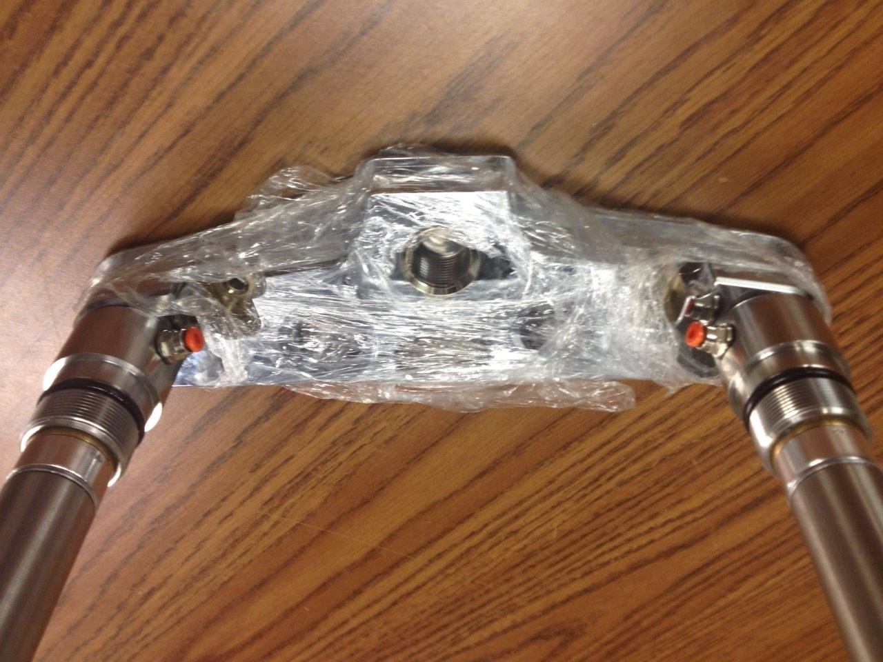 One inch stainless steel fork extensions are provided with a side port for the air inlet. Therefore, the air lines can be hidden under the upper triple tree and also be hidden by the stock fork covers.